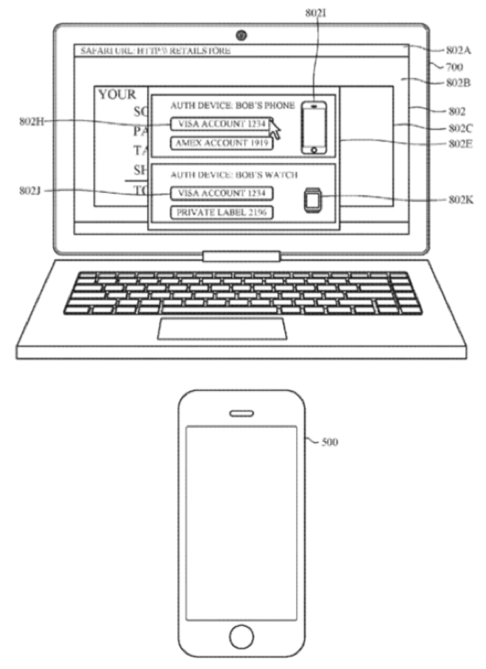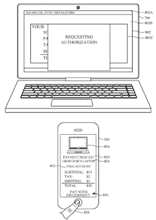 소개해드릴 Apple의 발명(US 15/269,801)은, Face ID가 등장하기 이전에 Apple의 제품에서 널리 적용된 Touch ID에 기반하는 발명입니다. 해당 발명은, 지문 스캐너가 없는 일반 컴퓨터, 예를 들어, 윈도우가 설치된 컴퓨터도 아이폰의 Touch ID를 이용해 결제할 수 있는 기술을 제안하고 있습니다. 예를 들어, 컴퓨터로 인터넷 쇼핑의 결제 창에 도달하였을 때, 아래의 도면과 같이, 사용자는 다양한 인증 수단을 선택할 수 있는 화면을 만나게 됩니다. 화면 내에서, 사용자는 컴퓨터를 제외한 생체 정보에 기반하는 인증이 가능한 다른 장비(스마트폰, 스마트워치 등)를 선택할 수 있습니다.